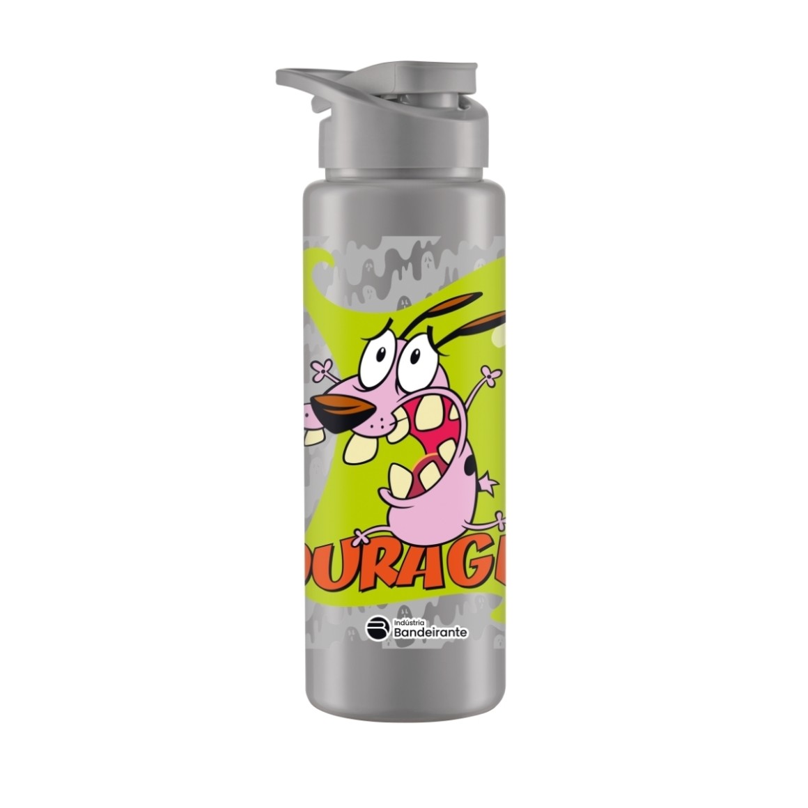 O squeeze sport possui uma capacidade de 750 ml, ideal para quem busca um tamanho compacto e prático para o dia a dia. Fabricado em PET, o squeeze é leve, durável e resistente. A estampa cinza apresenta o famoso Coragem, o Cão Covarde, tornando o produto um item de coleção para os fãs do desenho.