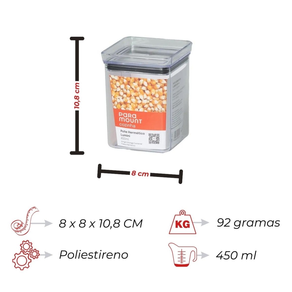 - Capacidade Generosa: Com 450 mL, é perfeito para guardar grãos, cereais, ou sobras de refeições, ajudando a manter a cozinha em ordem.