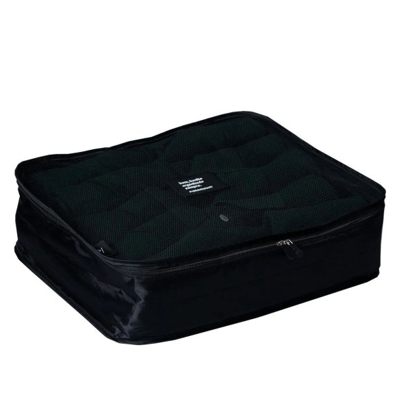 Ao abrir sua mala, você percebe como esse organizador é exatamente o que faltava. Com seu design em tela e sua cor preta sofisticada, ele não só traz um toque de elegância, mas também funcionalidade. Cada peça de roupa, sapato e acessório ganha seu espaço dedicado, sem confusão ou amontoamento. E ao visualizar facilmente o conteúdo através da tela, você se pergunta como fez suas malas sem isso antes.