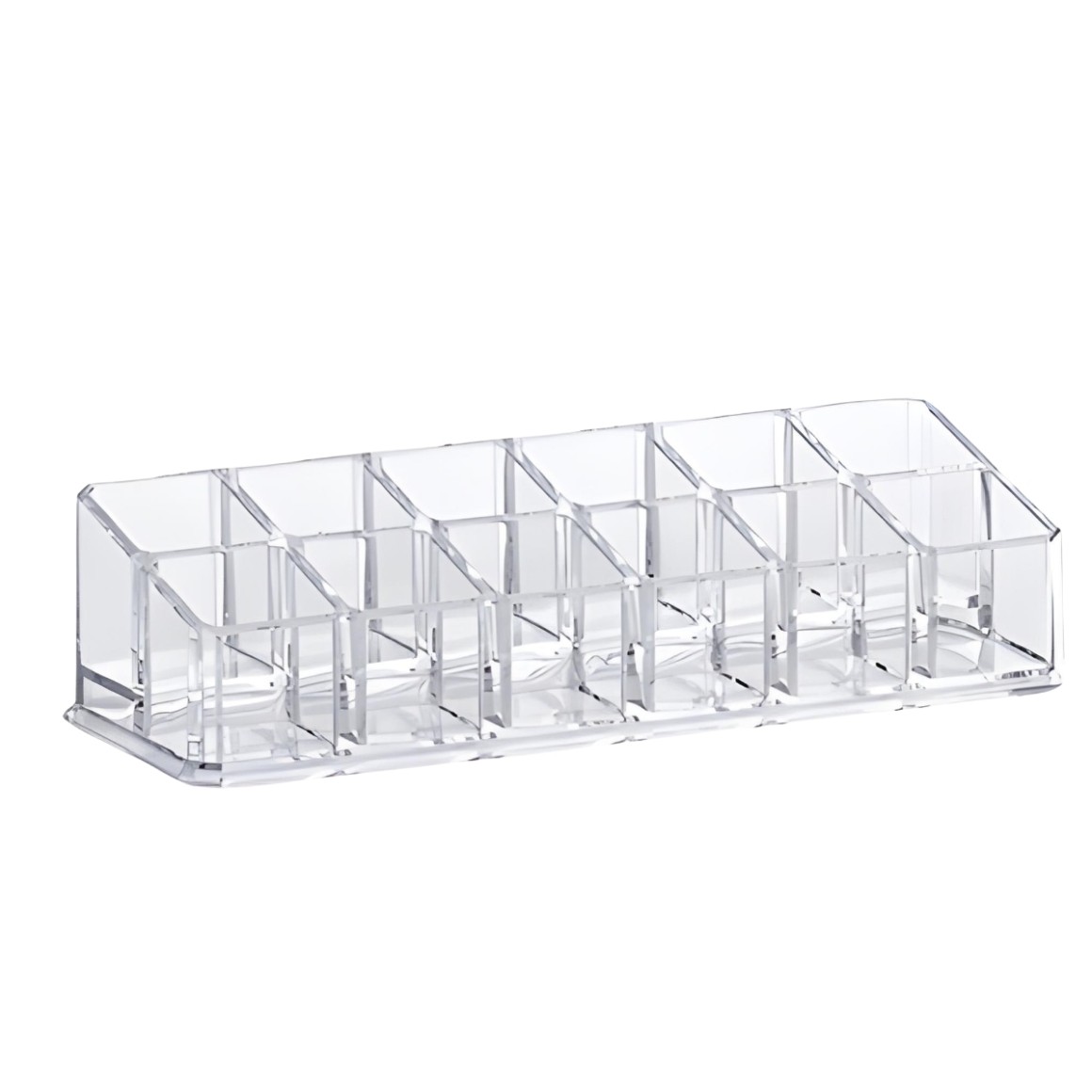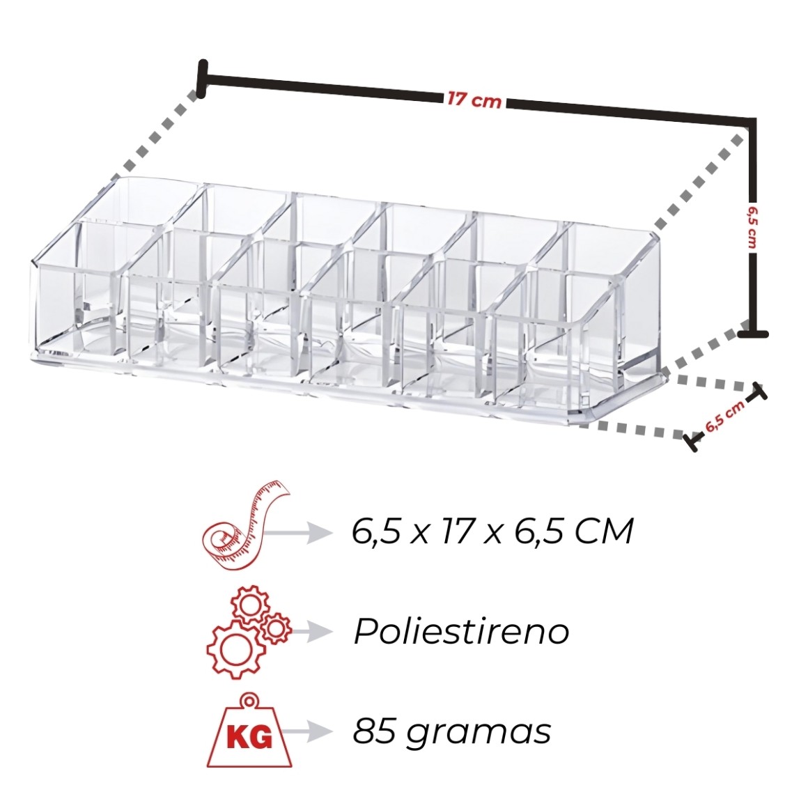 Fabricado em poliestireno transparente de alta qualidade, este organizador é resistente e durável, garantindo uma longa vida útil. Sua transparência facilita a visualização dos produtos armazenados, permitindo que você encontre facilmente o que precisa.