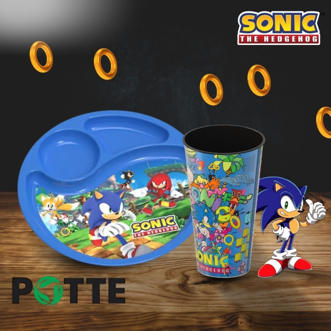 Kit composto por um prato com três divisórias e um copo de 500 ml, ambos estampados com o Sonic, perfeito para transformar as refeições em momentos divertidos e organizados.