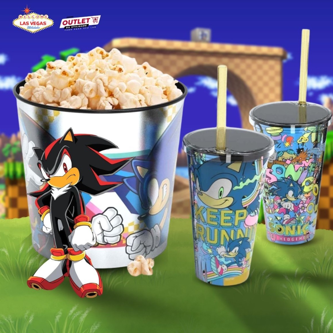 Um kit exclusivo e licenciado composto por 1 balde de pipoca de 4 litros e 2 copos de 500 ml com tampa e canudo, estampados com o Sonic, ideal para momentos de lazer e cinema em casa.