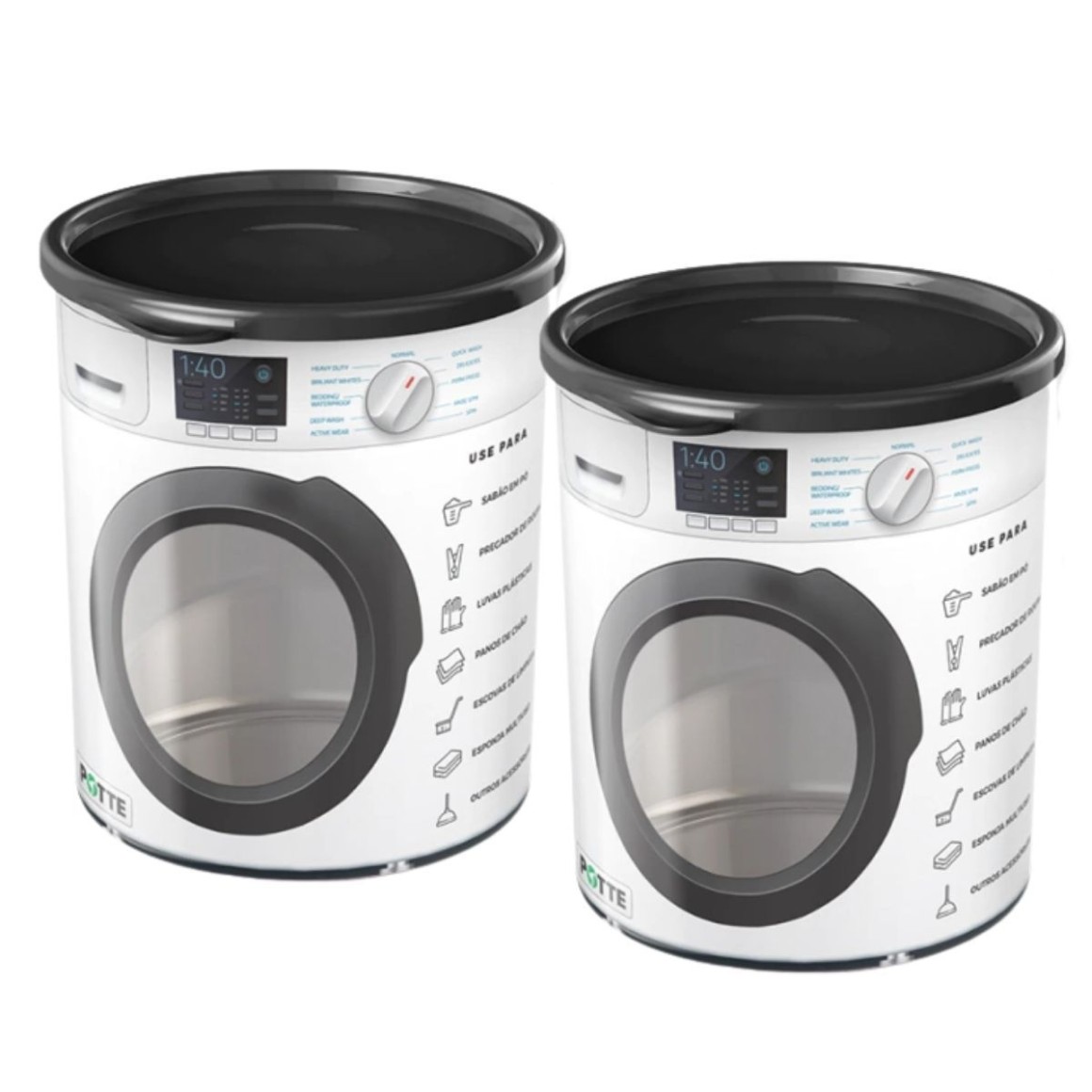 Kit com 2 potes organizadores multiuso para lavanderia, cada um com capacidade de 2,1 litros, design exclusivo imitando uma máquina de lavar e visor transparente para facilitar a visualização do conteúdo.
