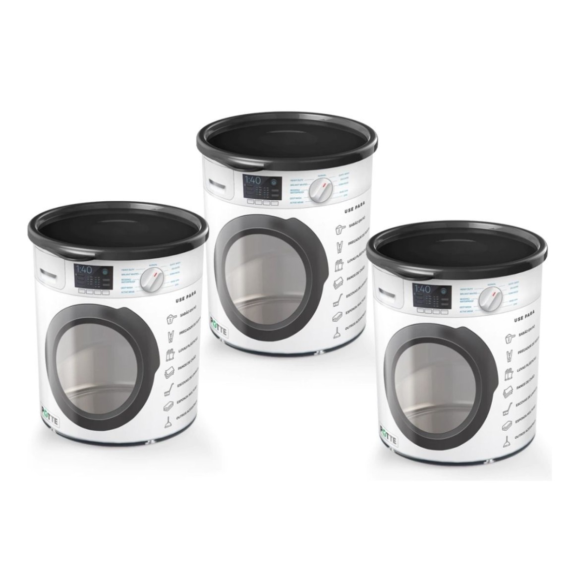 Kit com 3 potes organizadores multiuso para lavanderia, cada um com capacidade de 2,1 litros, design exclusivo imitando uma máquina de lavar e visor transparente para facilitar a visualização do conteúdo.