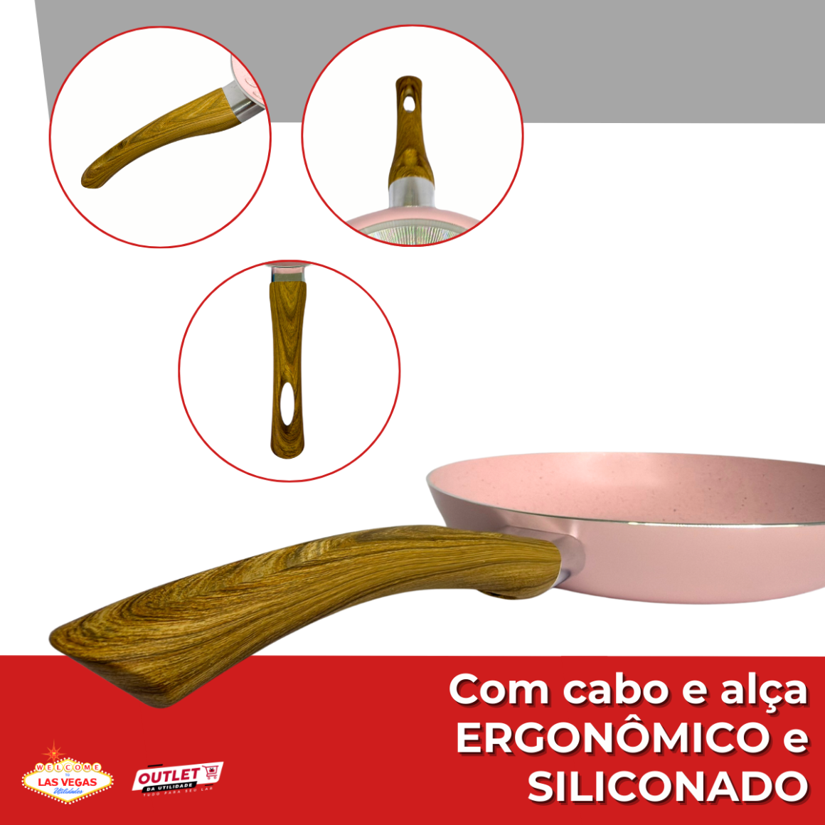 Produzida em alumínio de 2mm de espessura, possui revestimento cerâmico antiaderente que facilita o preparo de alimentos e a limpeza. O cabo ergonômico com acabamento amadeirado e toque siliconado proporciona mais conforto e segurança no manuseio.