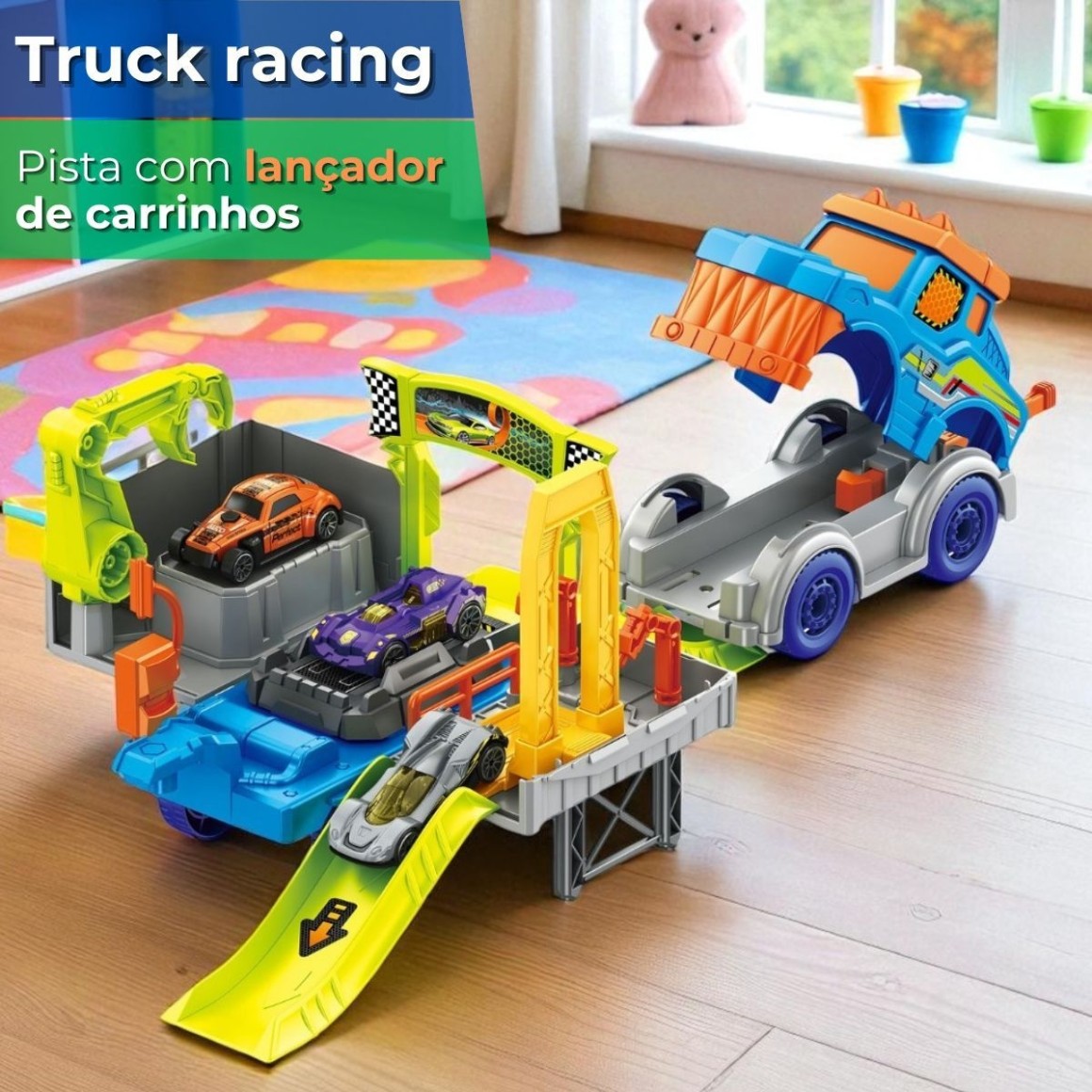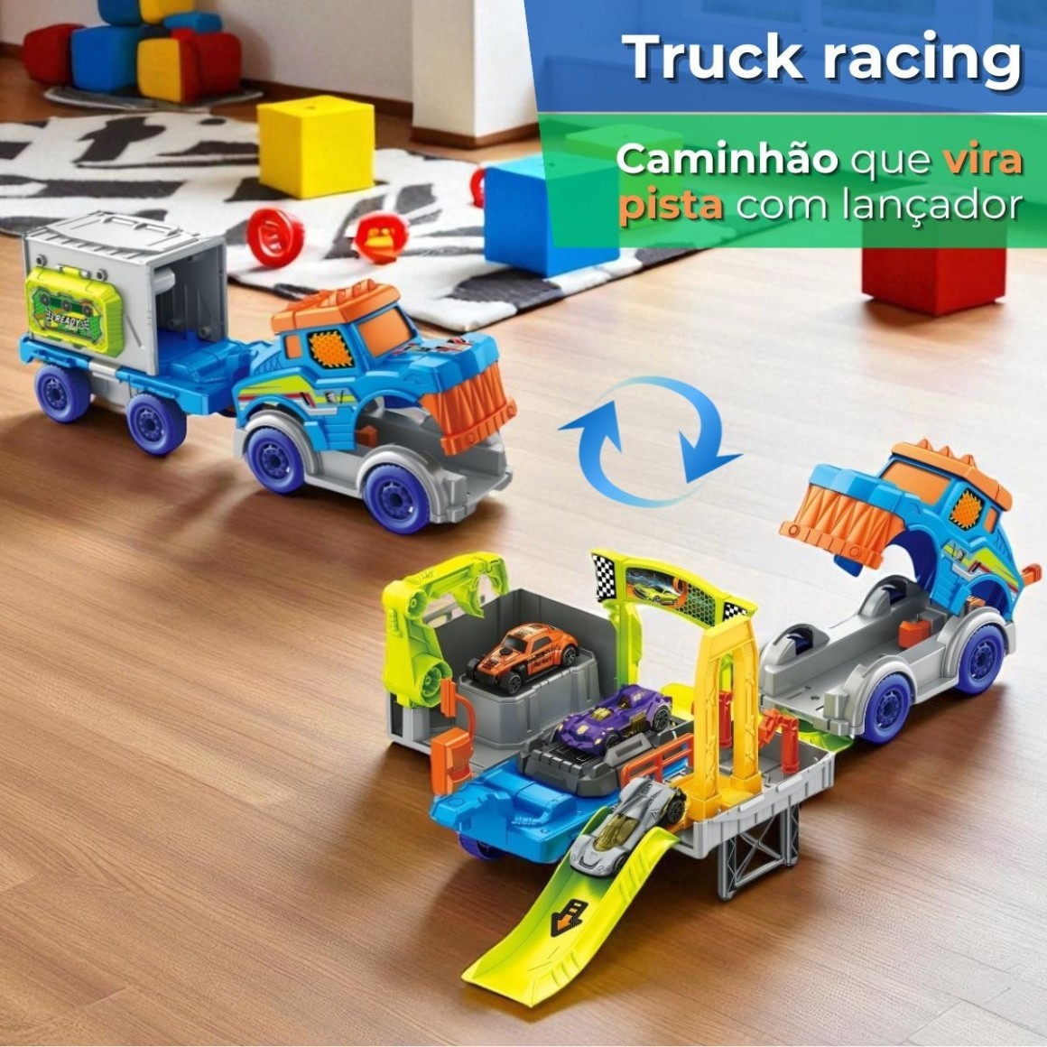 Caminhão que Vira Pista: O grande diferencial é o caminhão que se transforma em uma pista completa, trazendo versatilidade e praticidade à brincadeira.