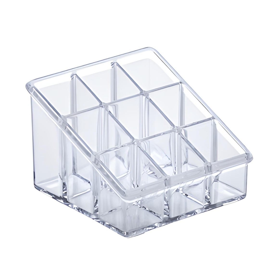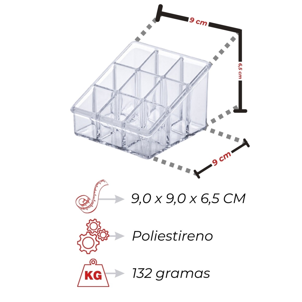 Fabricado em poliestireno transparente de alta qualidade, este organizador é durável e permite visualizar facilmente os produtos armazenados. Com suas dimensões compactas, é ideal para organizar pequenos itens de beleza, como batons, pincéis, esmaltes e outros acessórios.