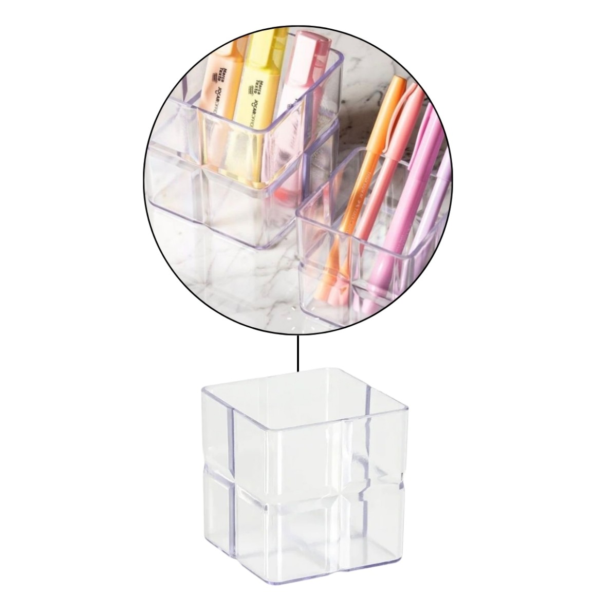 Com suas dimensões compactas, o Organizador Bisotê é ideal para organizar uma variedade de itens, como material de escritório, acessórios de maquiagem, bijuterias, pequenos objetos pessoais e muito mais. Seu formato quadrado e simétrico permite que você o empilhe ou alinhe facilmente, otimizando o espaço de armazenamento.