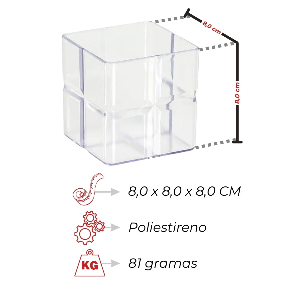 O Organizador Bisotê, com dimensões de 8,0 x 8,0 x 8,0 cm em Poliestireno Transparente da Paramount, é uma peça compacta e versátil, perfeita para manter pequenos itens de forma organizada em qualquer ambiente da sua casa ou escritório.