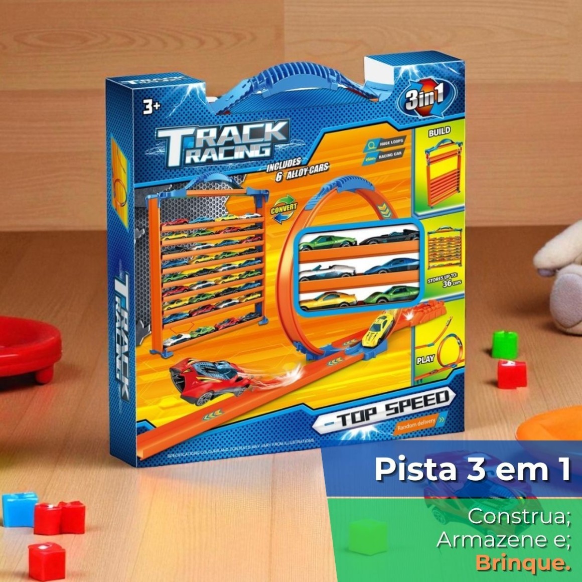 Organize e Corra: Deixe os carrinhos sempre organizados no expositor e, quando quiser correr, basta abrir e transformar em pista.