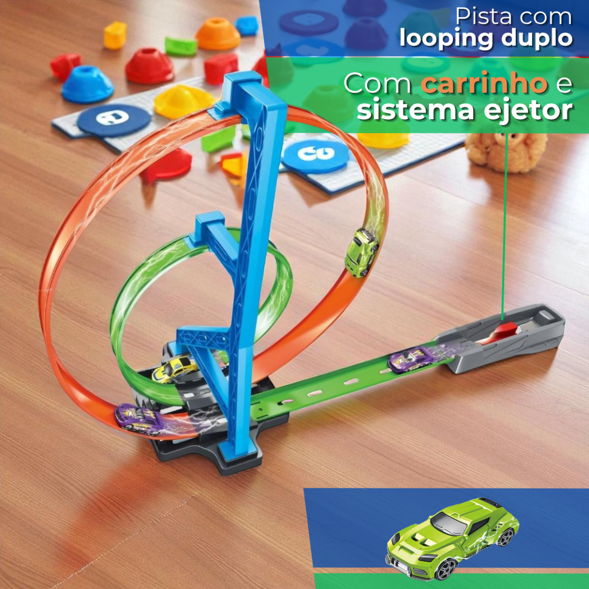 Pista com Looping 360º: O destaque deste brinquedo é o looping completo, que permite ao carrinho realizar voltas espetaculares e cheias de ação.