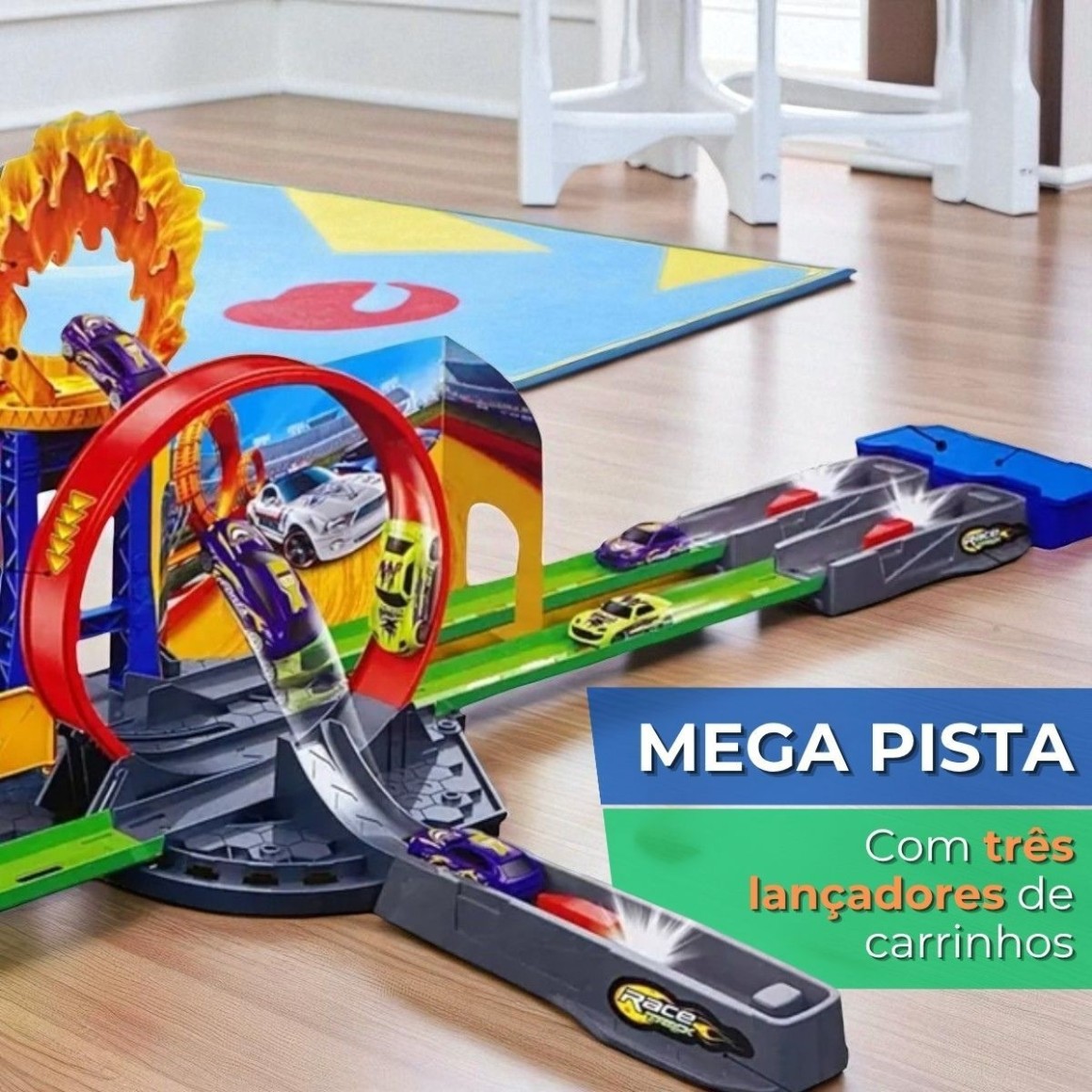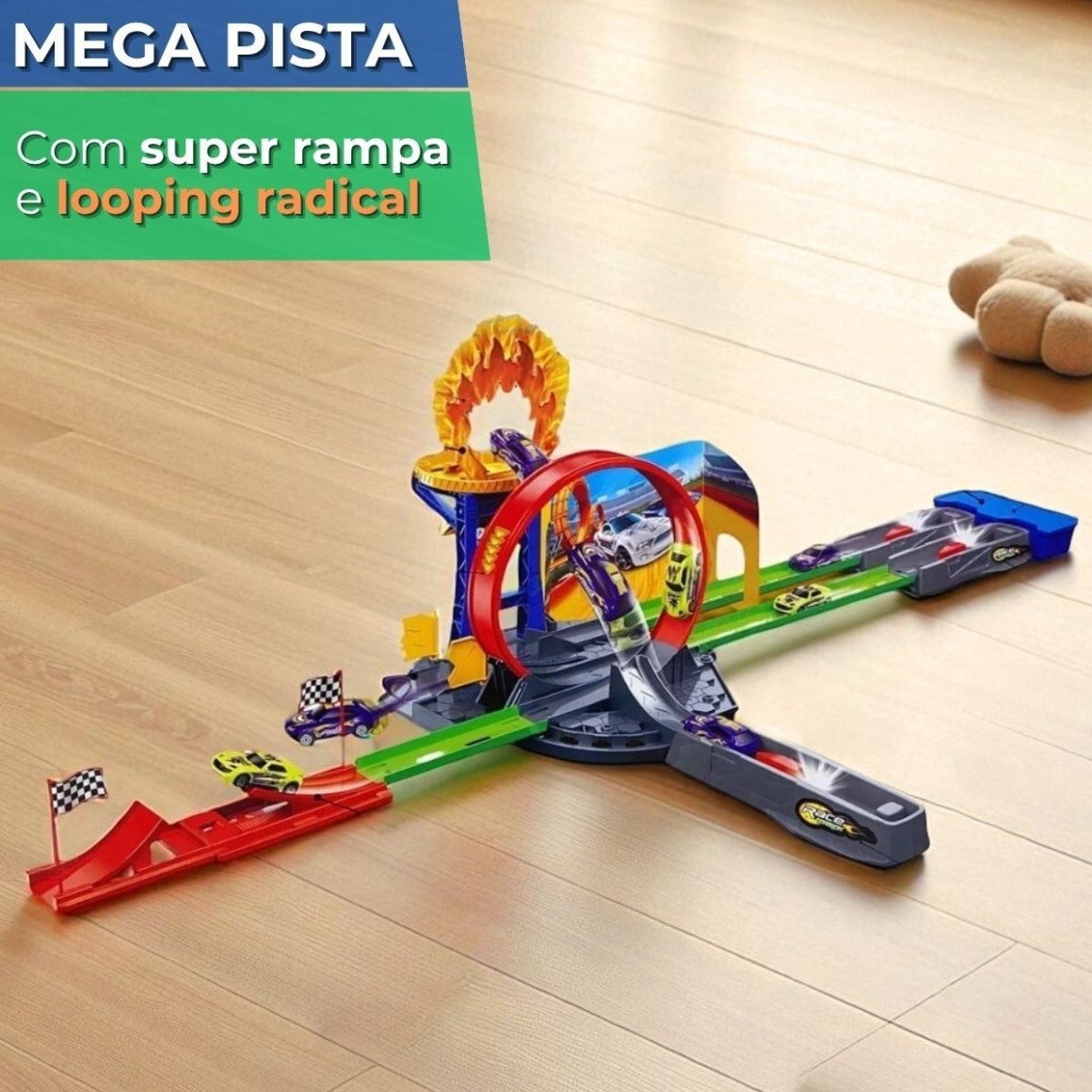 Pista com Looping: O grande destaque do brinquedo é o looping ousado, que desafia a gravidade e faz os carrinhos realizarem voltas espetaculares, enchendo a brincadeira de emoção.