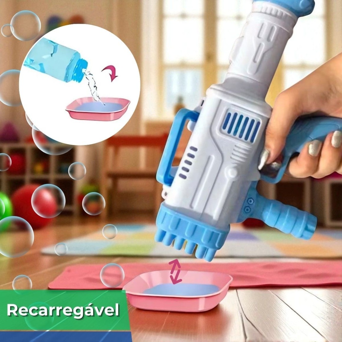 Com funcionamento elétrico e um design moderno, essa pistola cria uma verdadeira chuva de bolhas com suas 32 saídas, encantando crianças e adultos em qualquer lugar.