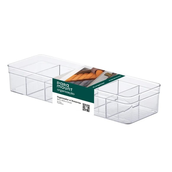 O Organizador Diamond Cristal com Divisórias, medindo 40,5 x 13,5 x 7,5 cm em Poliestireno Transparente da Paramount, é uma solução versátil e elegante para manter seus itens organizados em casa ou no escritório.