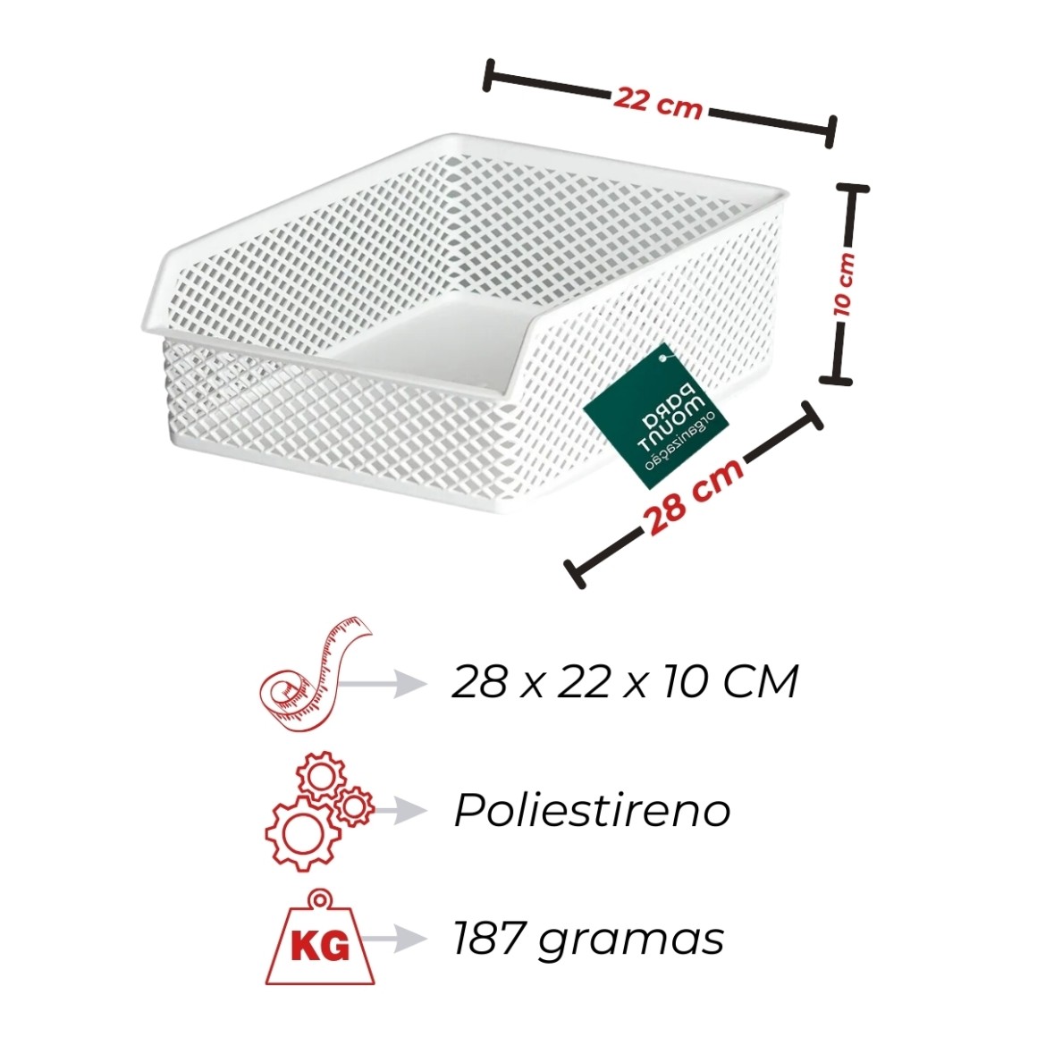 Com dimensões de 28 x 22 x 10 cm, oferece um espaço amplo para armazenar diversos itens, desde materiais de escritório até utensílios domésticos, acessórios de beleza e muito mais. A cor branca proporciona um toque clean e moderno ao seu espaço.