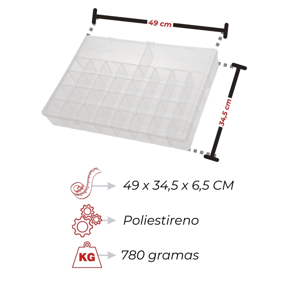 A Caixa Organizadora Plus, com dimensões de 34,5x49x6,5 cm e feita de poliestireno transparente pela Paramount, é a escolha ideal para manter seus itens organizados com estilo e praticidade.