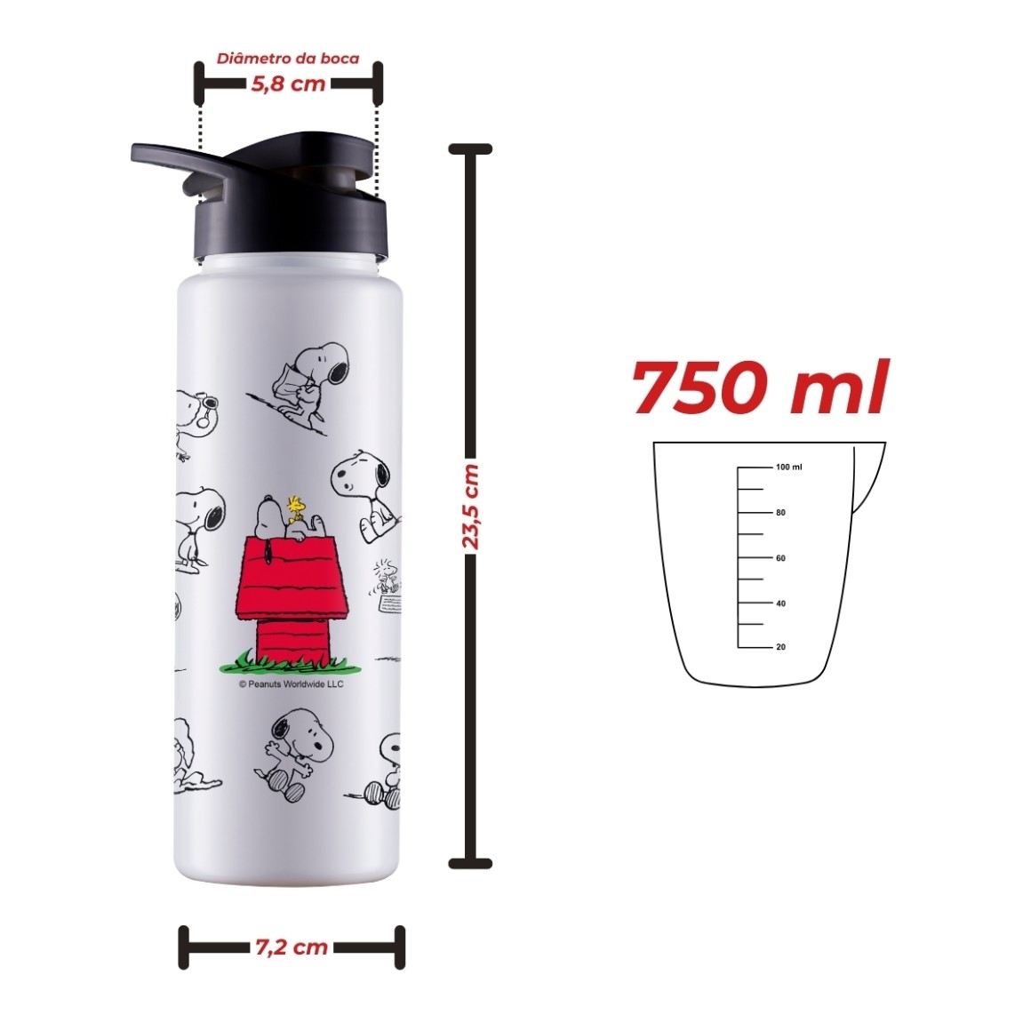 Com dimensões de 7,2 x 7,2 x 23,5 cm, este squeeze é compacto e fácil de transportar, cabendo perfeitamente em mochilas, bolsas e porta-copos de carro. Seu design inspirado no personagem Snoopy traz um toque de charme e nostalgia, tornando cada uso uma experiência especial.