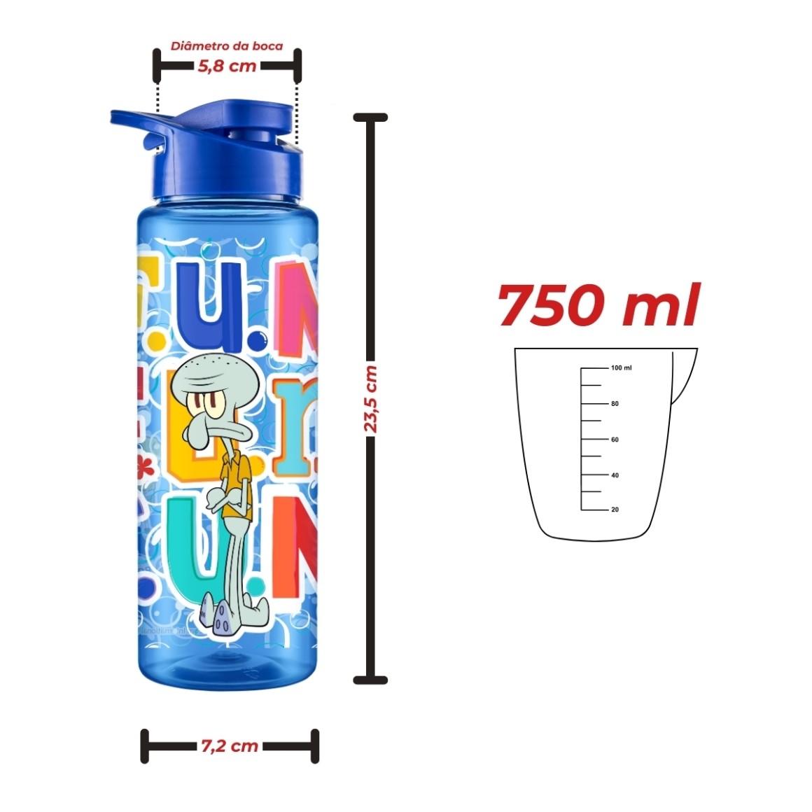 Com dimensões de 7,2 x 7,2 x 23,5 cm, este squeeze é compacto e fácil de transportar, podendo ser facilmente guardado em mochilas, bolsas e porta-copos. O design inspirado no personagem Lula Molusco do Bob Esponja adiciona um toque divertido e único à sua rotina de hidratação.