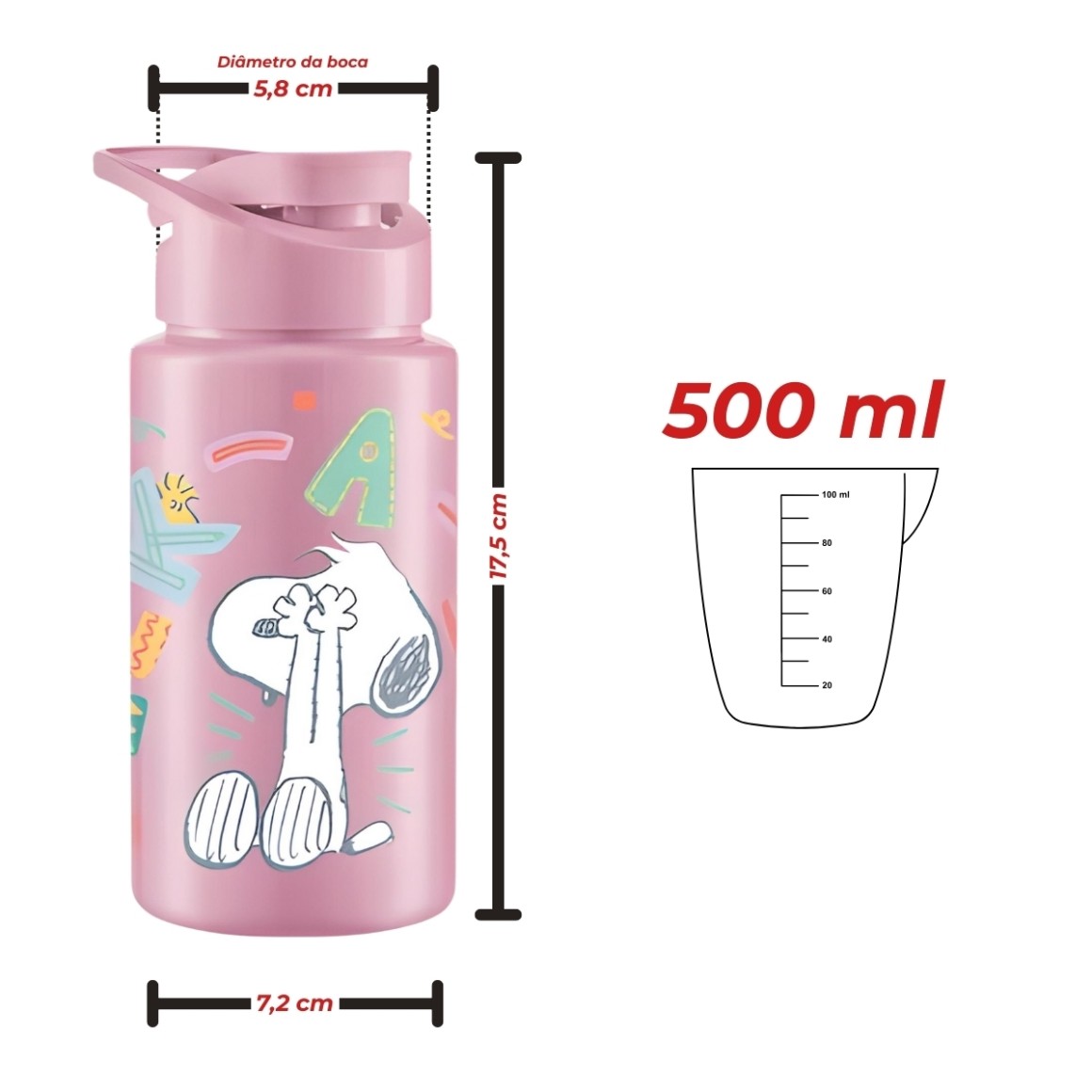 Com dimensões de 7,2 x 7,2 x 17,5 cm, o squeeze é compacto e fácil de transportar, cabendo perfeitamente em mochilas, bolsas e porta-copos. Seu design inspirado no personagem Snoopy do desenho Charlie Brown adiciona um toque de charme e personalidade, tornando a hidratação mais divertida.