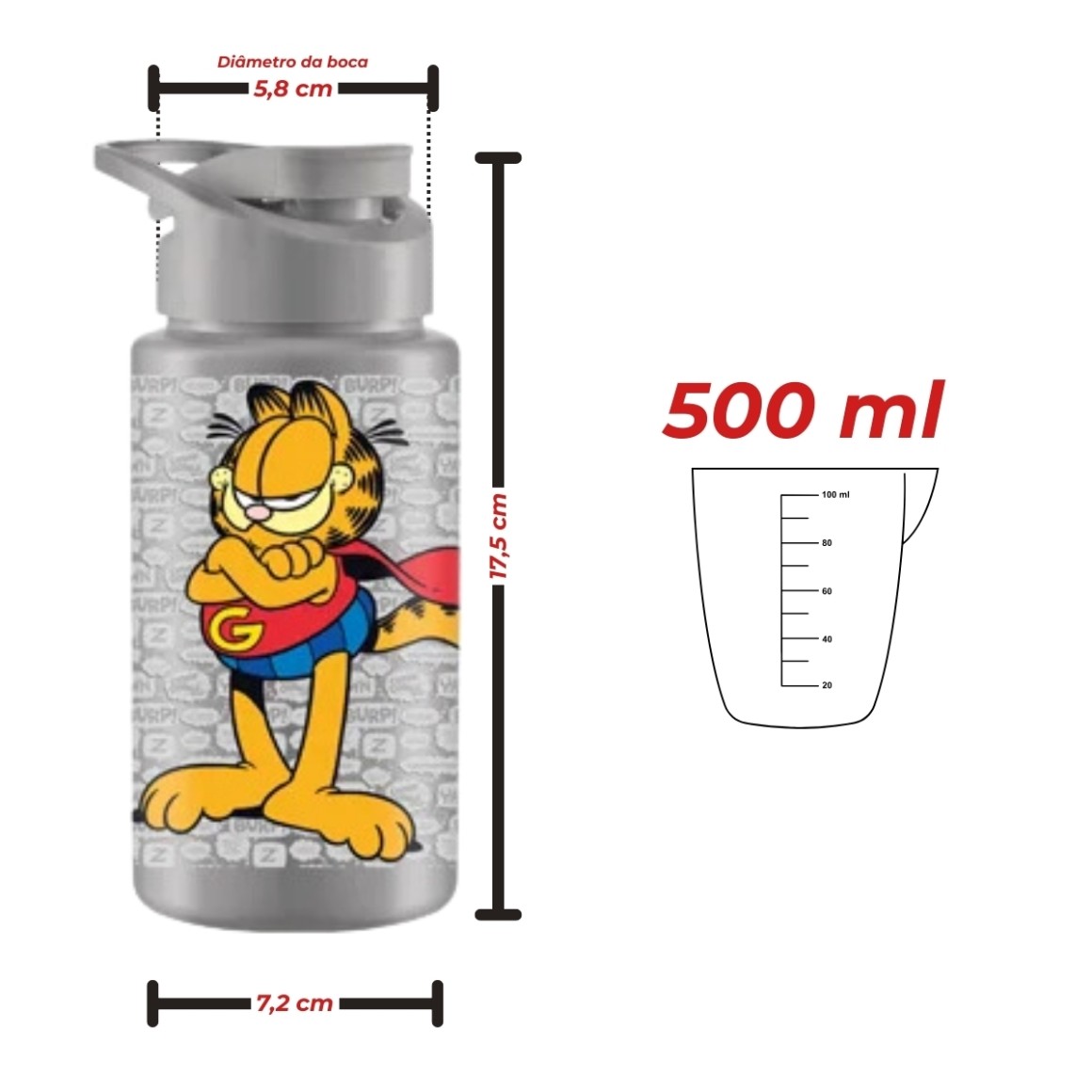 Com dimensões de 7,2 x 7,2 x 17,5 cm, o squeeze é compacto e fácil de transportar, cabendo perfeitamente em mochilas, bolsas e porta-copos. Seu design inspirado no personagem Gato Garfield adiciona um toque de humor e personalidade, tornando a hidratação uma experiência mais divertida.