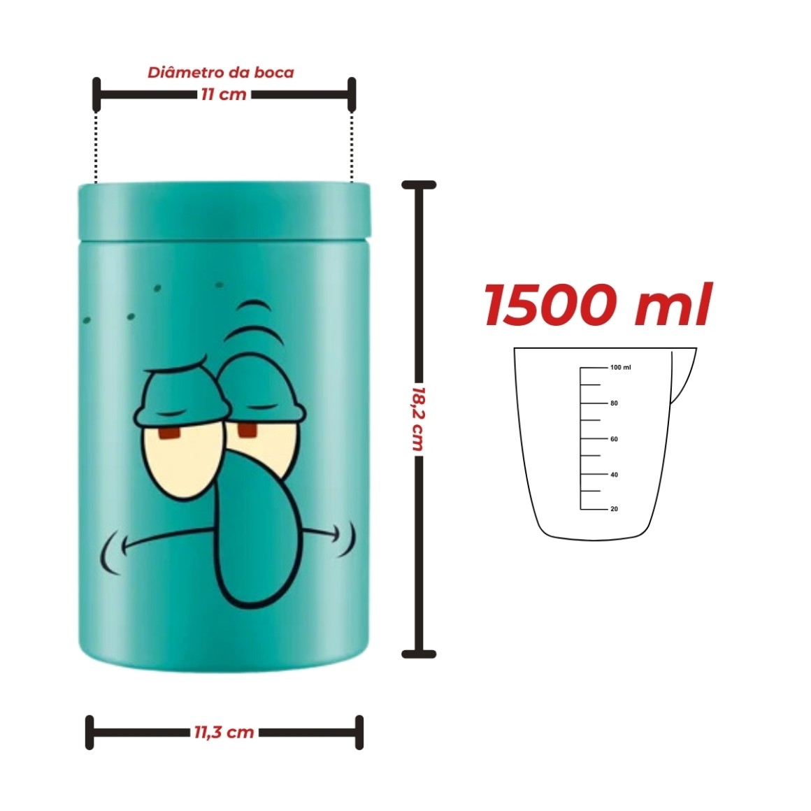 Com dimensões de 11,3 x 11,3 x 18,2 cm, este pote é compacto e fácil de transportar, cabendo perfeitamente em prateleiras, armários e mochilas. Seu design inspirado no personagem Lula Molusco, da Turma do Bob Esponja, adiciona um toque de diversão e personalidade, tornando a organização uma tarefa mais agradável.