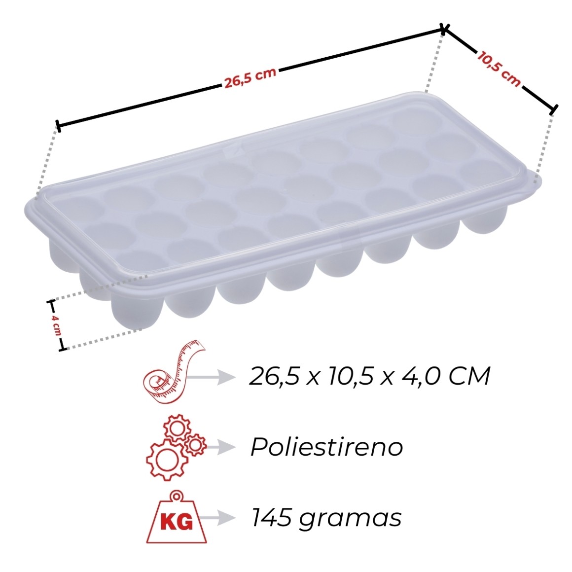Com dimensões de 26,5 x 10,5 x 4,0 cm, esta forma permite fazer cubos de gelo de tamanho considerável, ideais para drinks e coquetéis especiais. A tampa proporciona uma vedação segura, evitando vazamentos e odores indesejados, além de facilitar o empilhamento das formas no congelador.