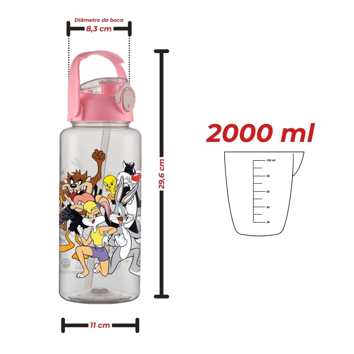 O squeeze sport dos Looney Tunes possui uma generosa capacidade de 2 litros, ideal para garantir hidratação ao longo do dia. Fabricado em PET, é leve, resistente e prático para o uso diário. A garrafa é transparente, permitindo a visualização do conteúdo, e vem com uma estampa divertida dos personagens mais queridos dos Looney Tunes, trazendo alegria para qualquer momento.