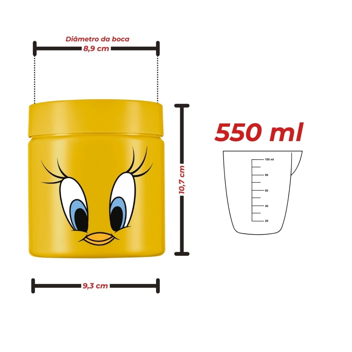 Design Temático: Tanto o pote quanto a squeeze apresentam o icônico Piu Piu, tornando este kit perfeito para fãs do personagem de todas as idades.