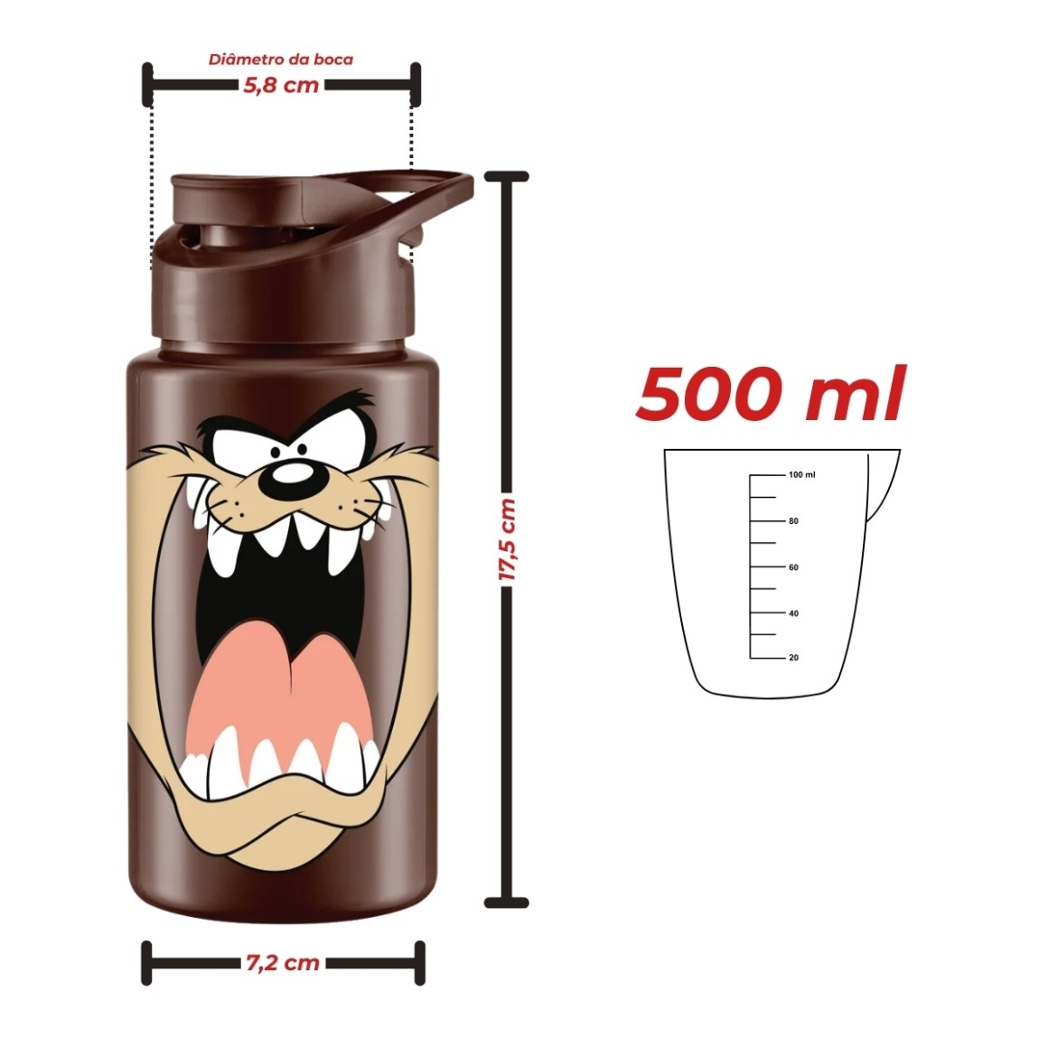 Design Temático: Tanto o pote quanto a squeeze são decorados com o famoso Taz, o personagem travesso dos Looney Tunes, tornando-os perfeitos para fãs de todas as idades.