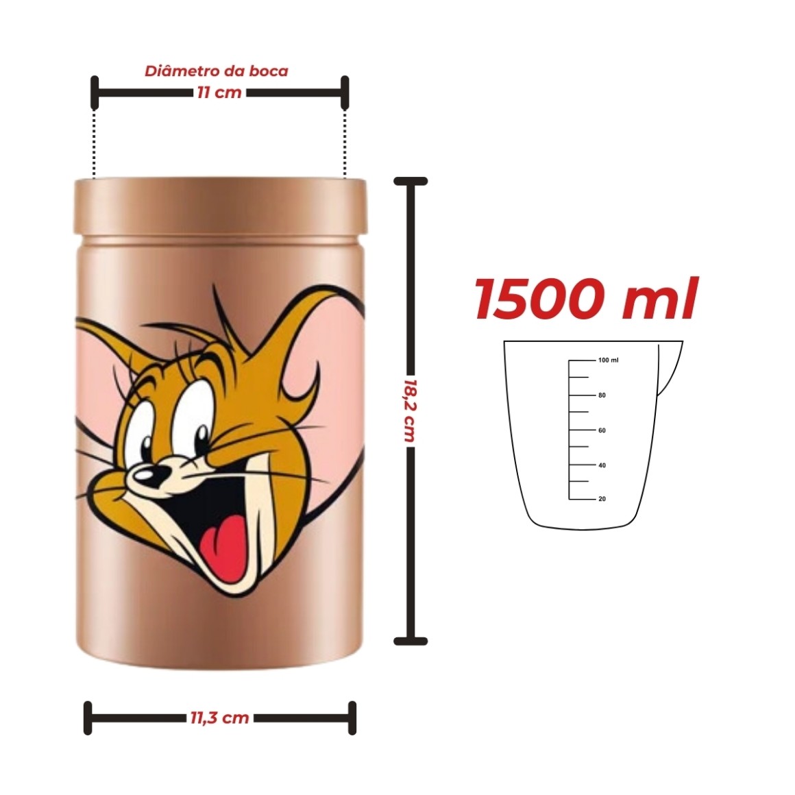 Descrição: Ideal para armazenar alimentos ou pequenos itens, este pote com a imagem do adorável Jerry é perfeito para quem aprecia a clássica série de animação. Seu design marrom é elegante e prático para o uso diário.