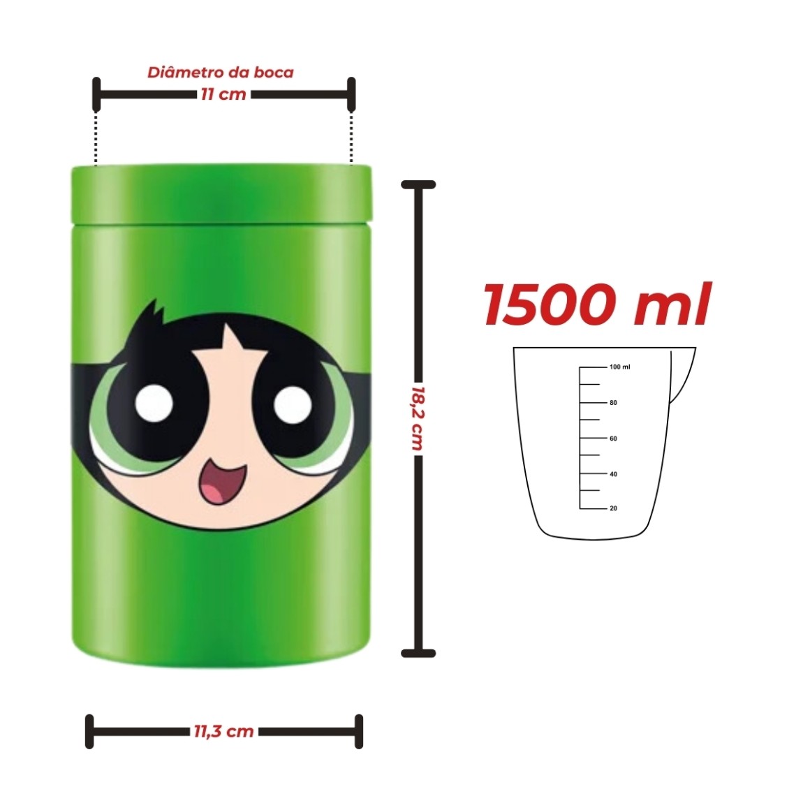 Descrição: Com o design da Docinho, este pote é perfeito para quem ama a Menina Superpoderosa com superpoderes de força. Ideal para armazenar alimentos ou outros itens com um toque de energia e cor.