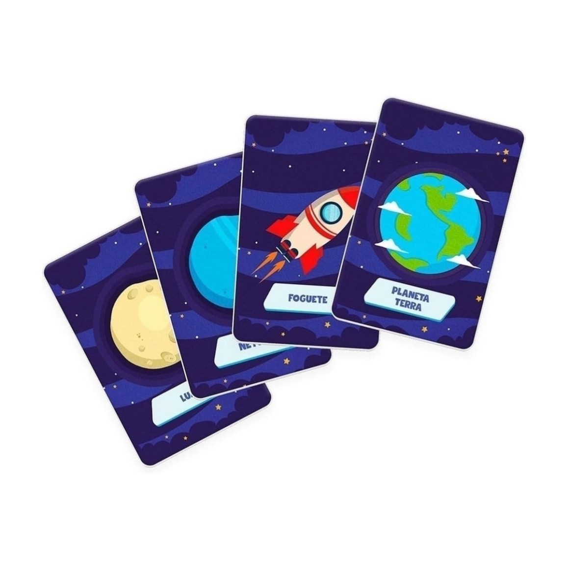 - Temática Espacial: Cartas com ilustrações divertidas e coloridas, inspiradas em planetas, estrelas e naves espaciais.