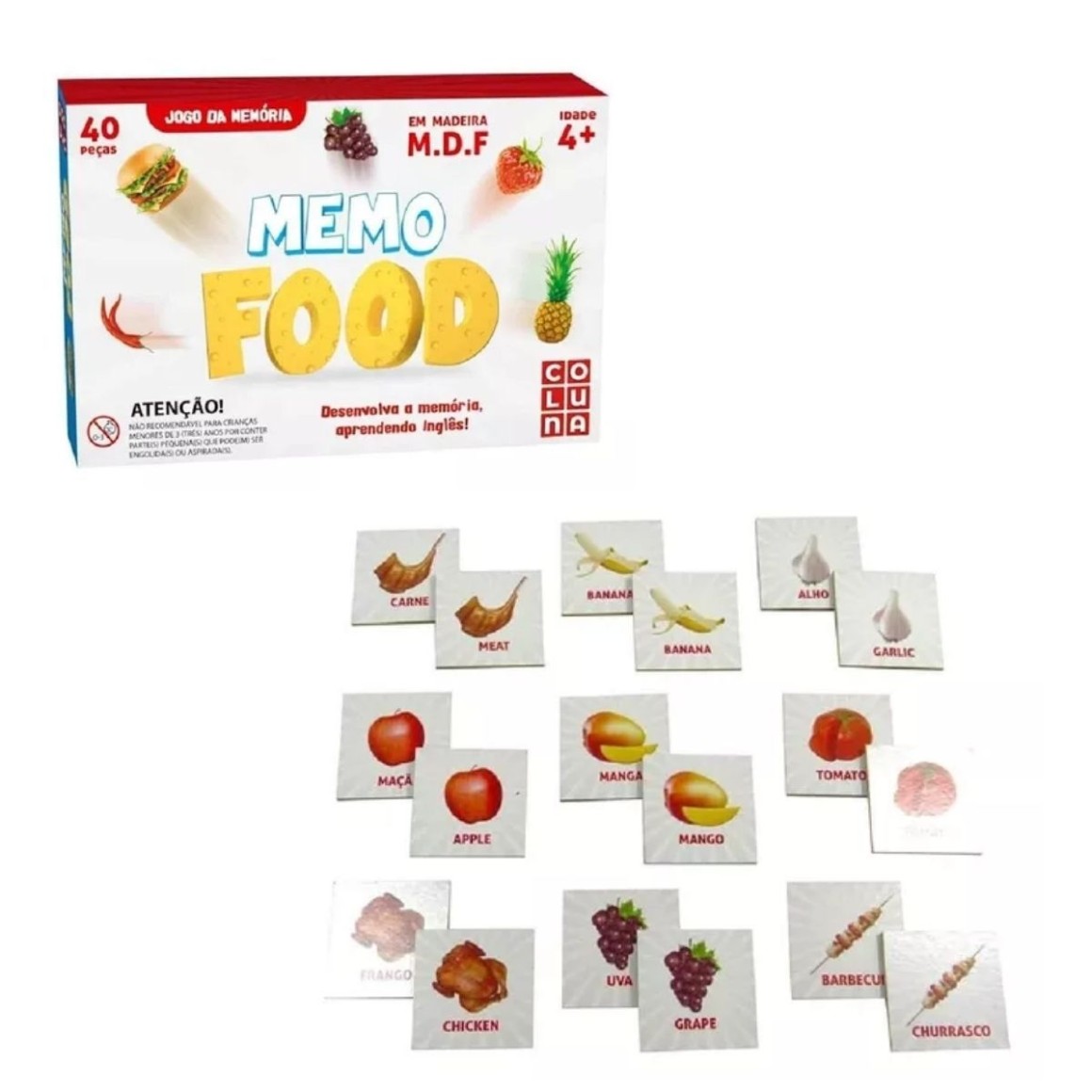 - Peças: 40 peças com ilustrações de comidinhas variadas.