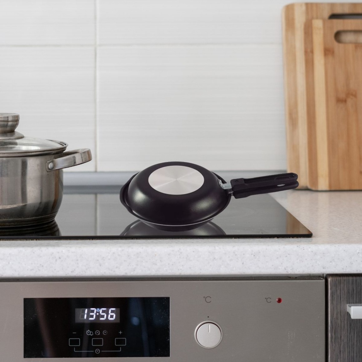 Composta por duas frigideiras que se encaixam perfeitamente, essa omeleteira permite virar o alimento com segurança, sem sujeira e sem a necessidade de utensílios adicionais. O revestimento antiaderente de alta qualidade evita que a comida grude, permitindo um cozimento uniforme com menos óleo.