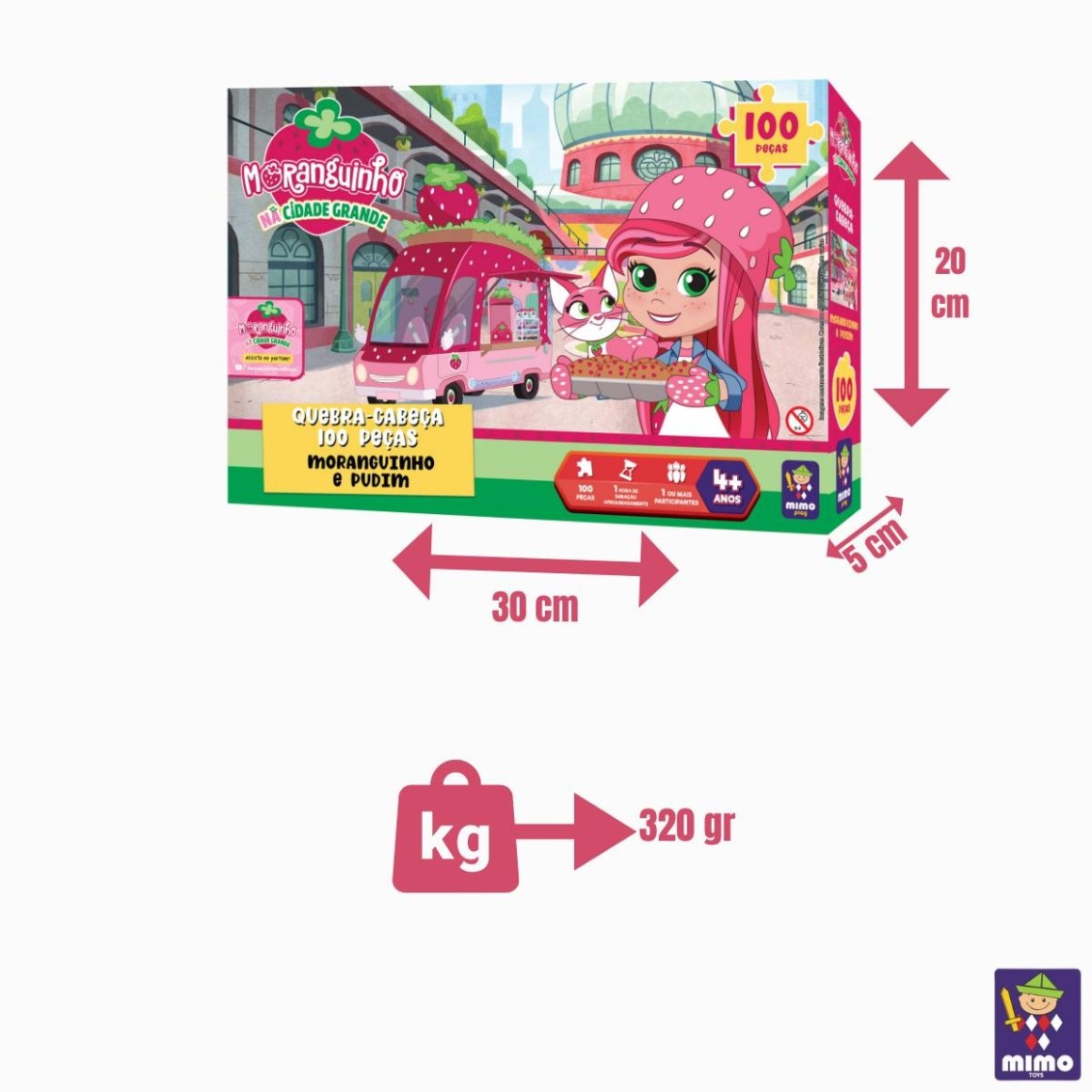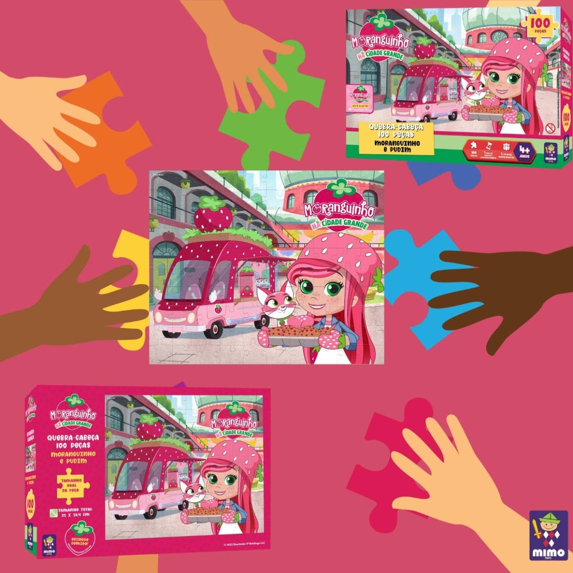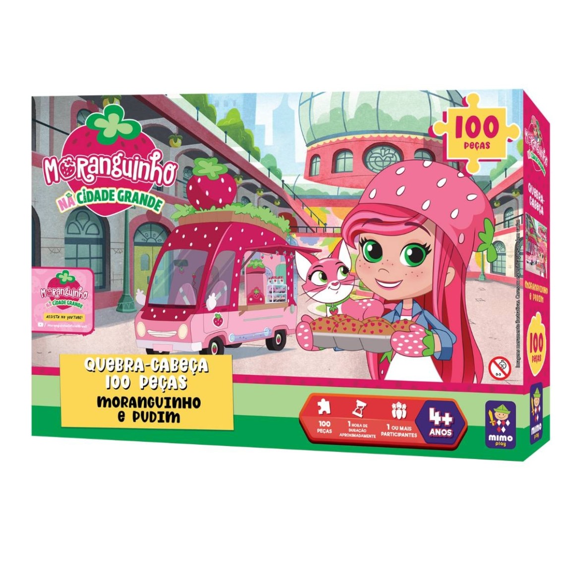 Um lindo quebra-cabeça de 100 peças que traz a adorável Moranguinho e seu gatinho Pudim na Cidade Grande.